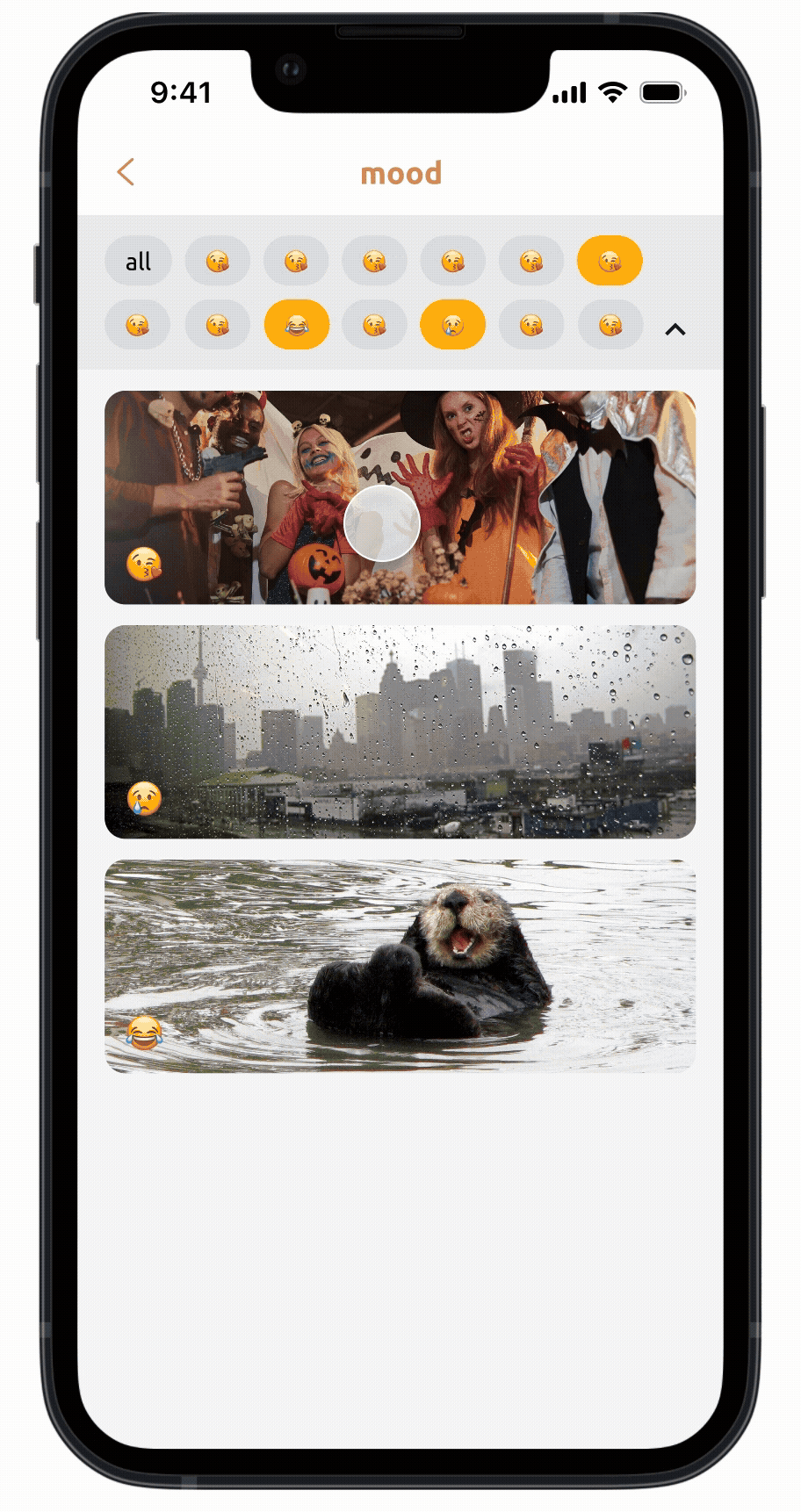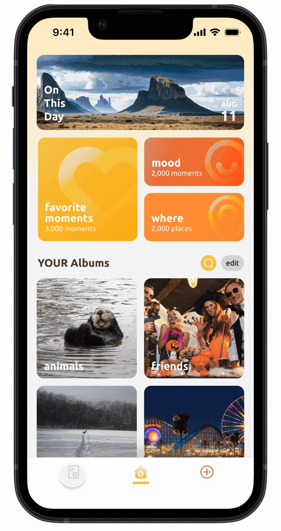 Moments are intelligently grouped by the emotions users record, then organized into date-based albums—making it effortless to look back and see how each day felt